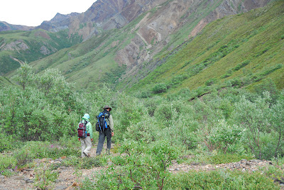 Day 2, we woke up early and headed off for what we planned to be our one-long-hike day. We first headed up Cathedral Mountain. When we got off the bus, a visitor yelled out, "Can I have your tent if you don't come back?" Another person asked, "Where are you going???" Denali hiking is on trail-less terrain. You get off the bus in the middle of nowhere and go wherever you want with the help of a topo map and a GPS. (Julie and I observed that if Brady and Aaron got eaten by a bear, we would probably be goners, too, by virtue of the fact that we can't use either.)