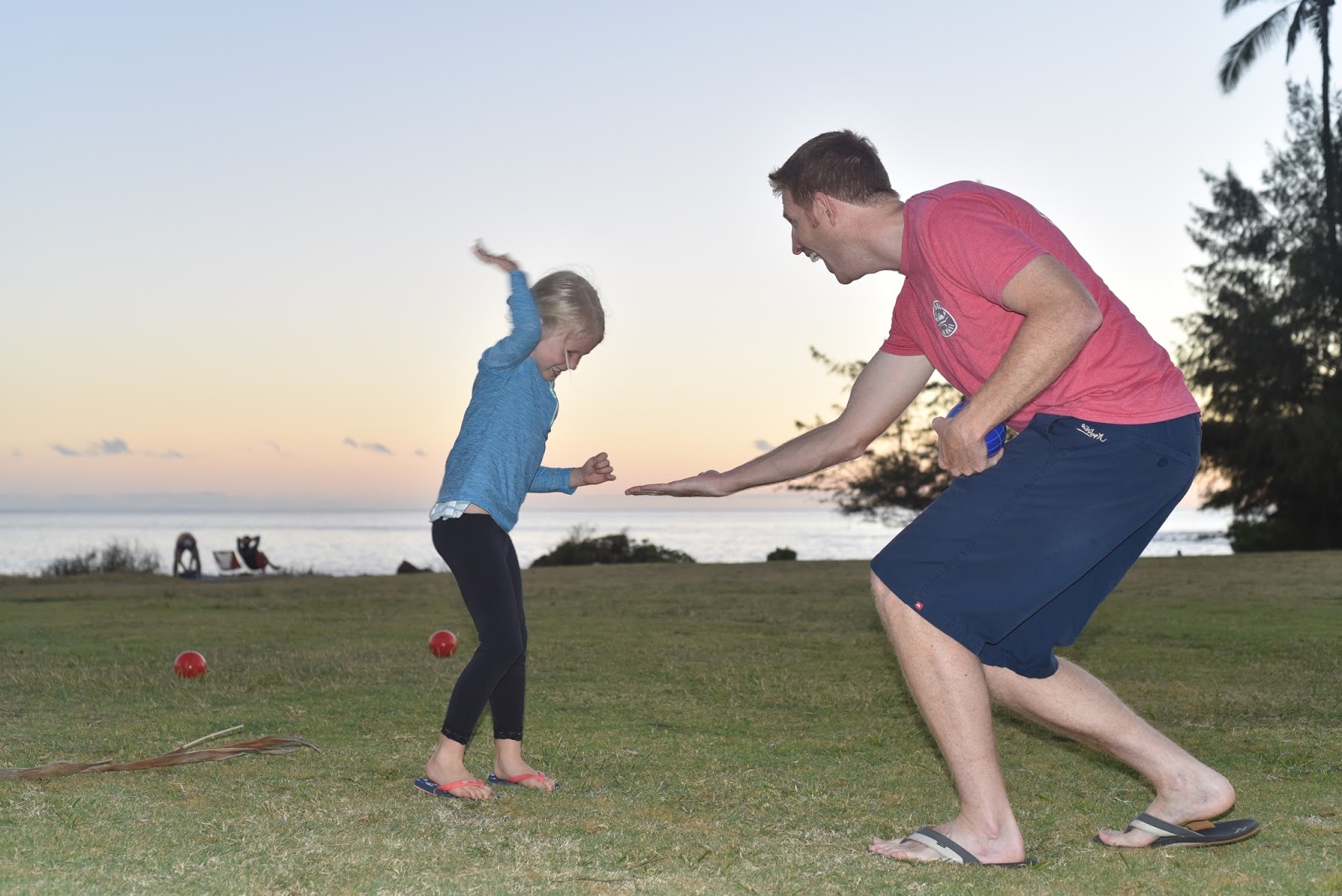 This past weekend was one of my favorite of Owen's life. We ran over to Poipu Beach park in the evening and played Bocci ball until the sun set, then to Lappets to finish off the evening. It was so charming.