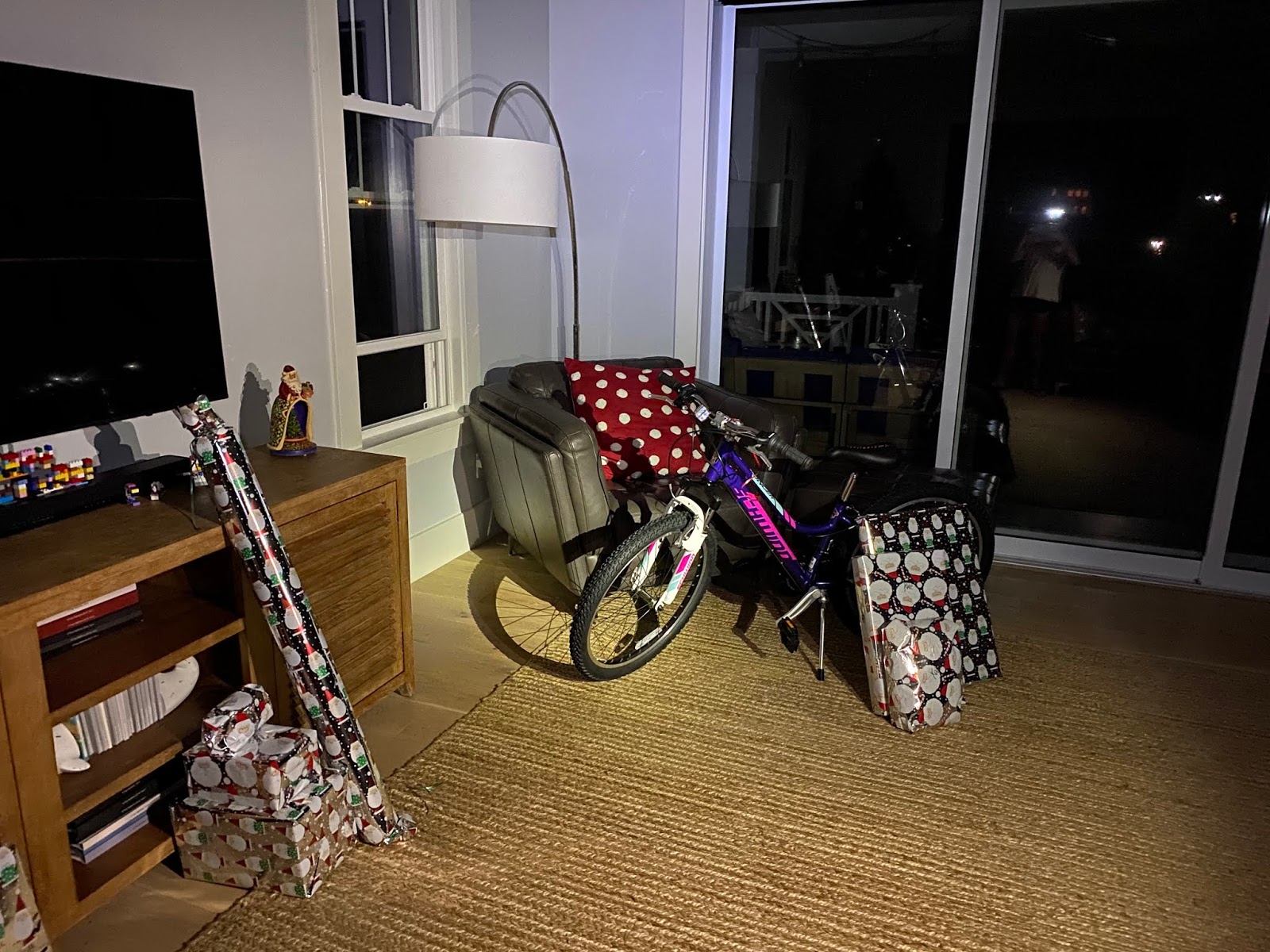 Kate wasted no time jumping on her bike. I wondered if Santa overshot her abilities with a 24" bike, but she had zero problems with the size.