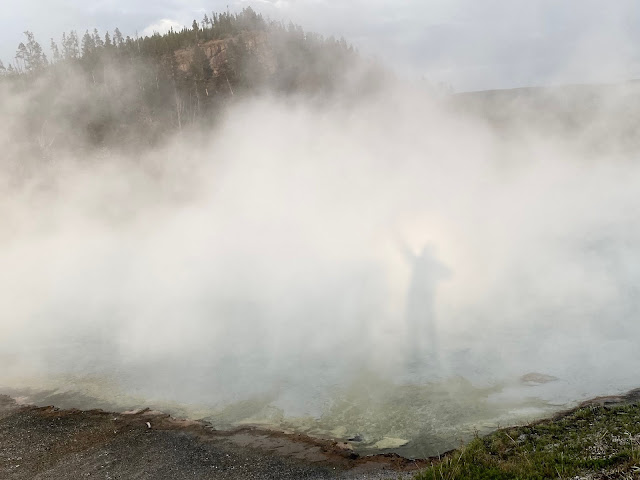 We drove through Hayden Valley, searching far and wide for wildlife. Zachary kept playing wolf by yelling "Bear!" A few times, he yelled right in my ear, then followed up by saying, "Sorry, Mama Bear." We spotted plenty more bison as well as elk. Zac dropped a couple more funny lines: "I see yolk out there!" and "Nice eye, Mom guy!"